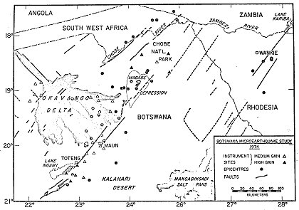 | This map shows the frequencies of earthquakes in the Okavango. It is estimated they receive one significant quake a day. |