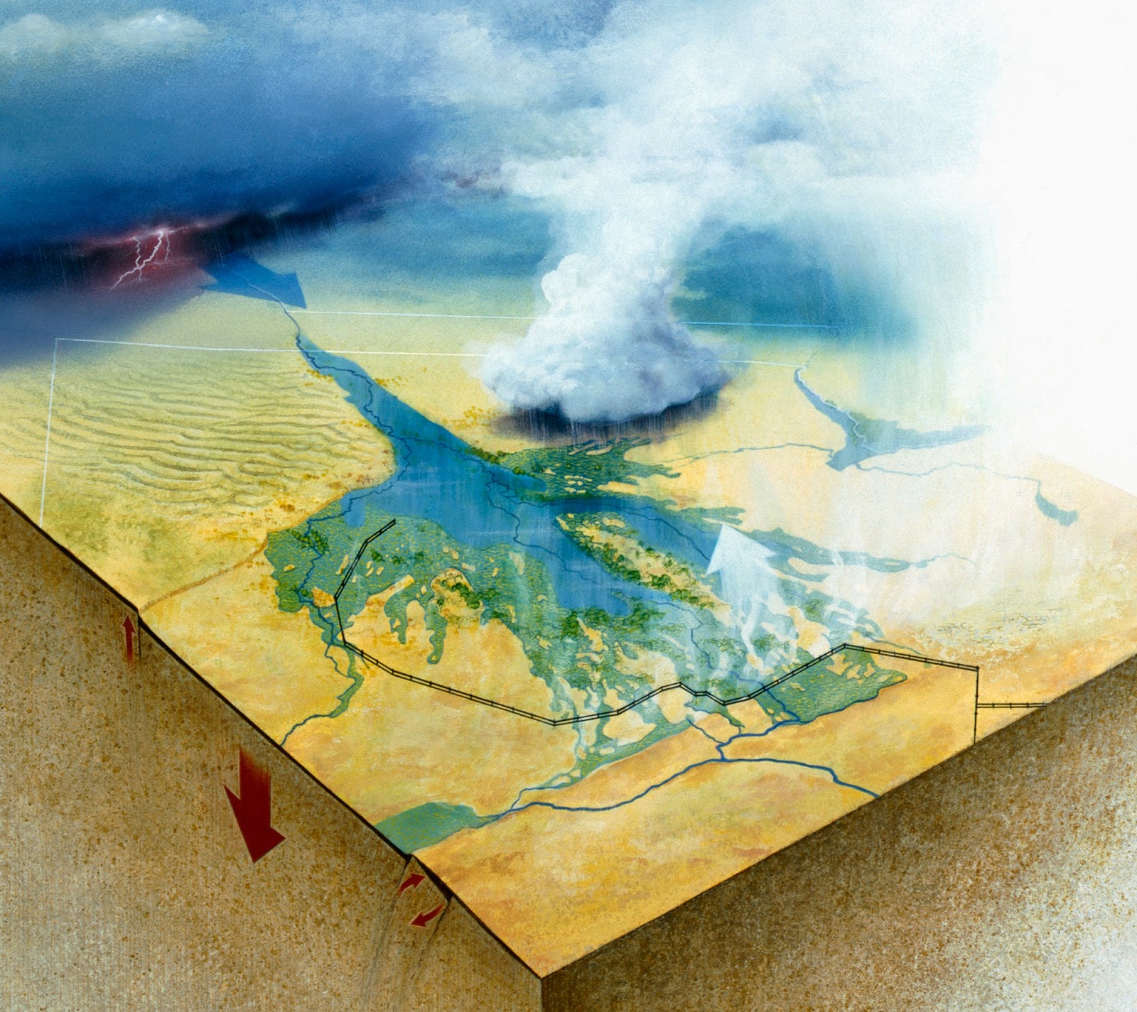 The African Rift Valley to the northeast in Ethiopia holds all of the secrets to the Okavango's future. The African Rift Valley is an area where the African and Somali plates are tearing apart creating a massive tear, or rift. Due to recent seismographic findings in the Okavango we can assume that the rift valley takes a westerly angle and cuts right through the delta. This means that as the rift continues to separate, the faults that create the Okavango will also continue to separate and create a large valley out of the current delta. We can hypothesize from this that in the future the delta will look much like the rift valley of today and the current rift valley will be a massive bay area as the Indian Ocean begins to flood into Africa. The current rift valley is characterized by jagged hills and large volcanoes, this is the future of the Okavango as well.